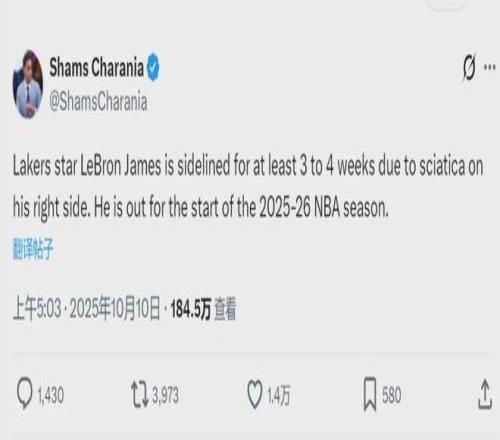 北京时间10月10日凌晨5点,NBA名记Shams报道,勒布朗-詹姆斯因右侧坐骨神经痛,至少缺阵3-4周。常规赛将在10月22日开打,詹姆斯不仅季前赛报销,还要缺席半个月的常规赛。这是詹姆斯生涯,第一次缺席常规赛揭幕战。