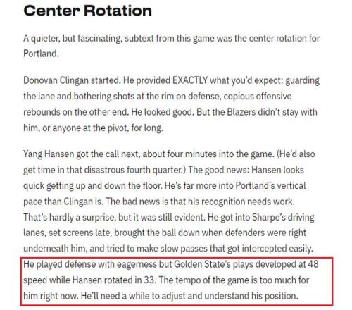 杨瀚森在比赛进行了大约四分钟左右替换上场。(在那灾难性的第四节,他也获得了上场时间。)好消息是:瀚森看起来跑动迅速。他比克林根更适应开拓者的节奏。坏消息是,他的防守意识还有待提高。这并不令人意外,但仍然显而易见。他在夏普的突破路线上设置掩护总是慢一拍,带球时被防守球员紧紧跟随。他尝试进行传球,速度偏慢但很容易被拦截。他防守时很积极,但勇士队的进攻节奏以48的速率展开,瀚森则以33的速率轮换。现在的比赛节奏对他来说太快了。他需要一段时间来调整和理解自己的位置。