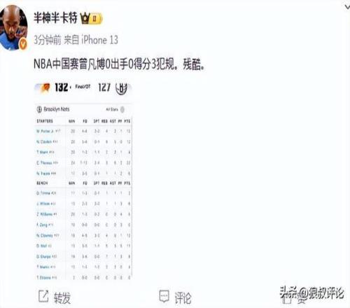 媒体人苏群发文点评:曾凡博这么好身体条件,我看篮网都把他注册成2米11了,还是需要更好的训练。季前赛第一场打10分钟,连出手机会都没有,也不能全怪边缘球员争饭碗太独。下一场篮网应该会给他差不多时间,但不是靠加时赛达到10分钟。对曾凡博来说,虽然还没有达到NBA的要求,但这张体验卡得来也不容易,好在还年轻,希望这不是终点,而是起点。