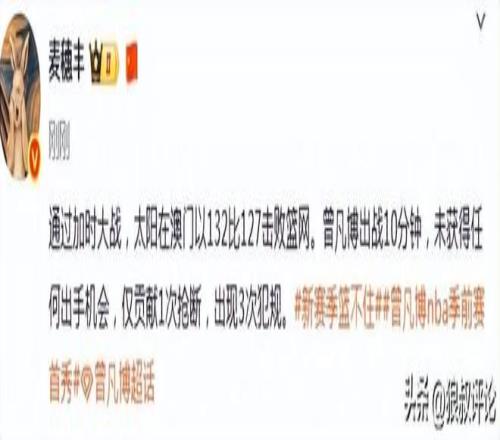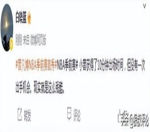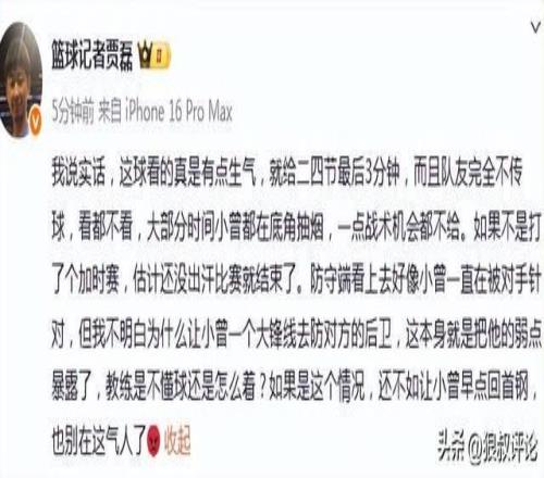 篮球记者贾磊发文点评:我说实话,这球看的真是有点生气,就给二四节最后3分钟,而且队友完全不传球,看都不看,大部分时间小曾都在底角抽烟,一点战术机会都不给。如果不是打了个加时赛,估计还没出汗比赛就结束了。