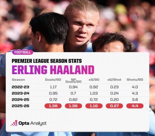 据Opta统计,哈兰德本赛季每90分钟射门、进球等数据创造英超生涯新高。