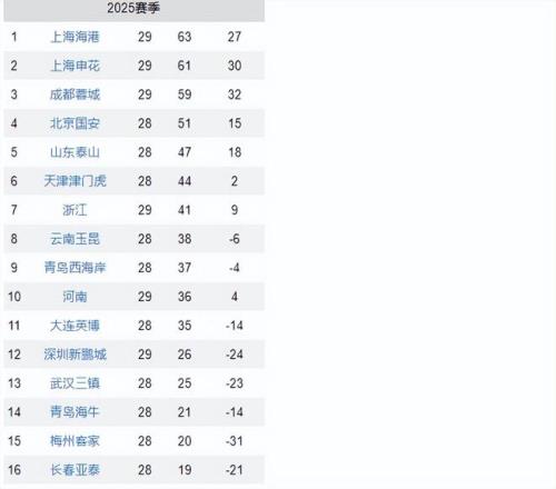 上海海港、上海申花均在本轮取胜,成都蓉城1-2负于河南,积分榜上,成都蓉城59分提前1轮退出争冠,上海海港63分、上海申花61分最后一轮争冠,但是在上海海港握有2分的优势下,他们下轮只要打平就可以夺冠。