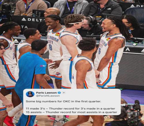 第一节雷霆轰出45-20的攻击波,直接打成垃圾时间。雷霆单节命中11记三分,打破队史纪录。本赛季雷霆累计净胜分达到388分,这是NBA历史上开季24场比赛的最大净胜分纪录。2015-16赛季勇士开季24连胜,总净胜341分。