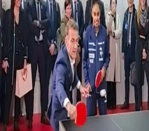 马克龙与王楚钦、孙颖莎等打乒乓球